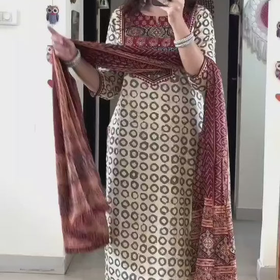 A-Line Cotton Kurta Set With Embroidery Detailing - Sleeves Attached