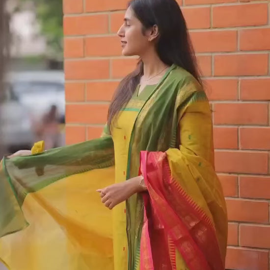 A-Line Cotton Kurta Set With Embroidery Detailing - Sleeves Attached